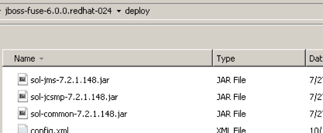 To install the Solace JMS libraries, copy the required Solace libraries under the JBoss Fuse deploy folder. Following Solace JMS library is required: